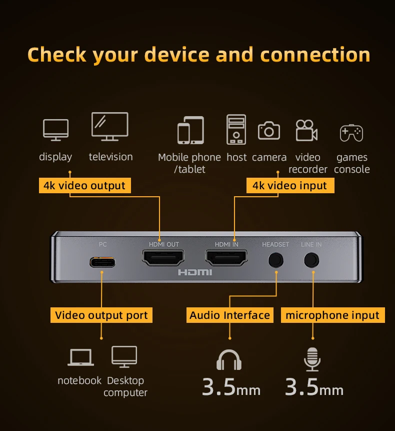 تشمل HDMI IN، HDMI OUT، Type-C، ومداخل الصوت، تدعم أجهزة الكمبيوتر، الجوالات، الكاميرات، الشاشات، وأجهزة الألعاب.
